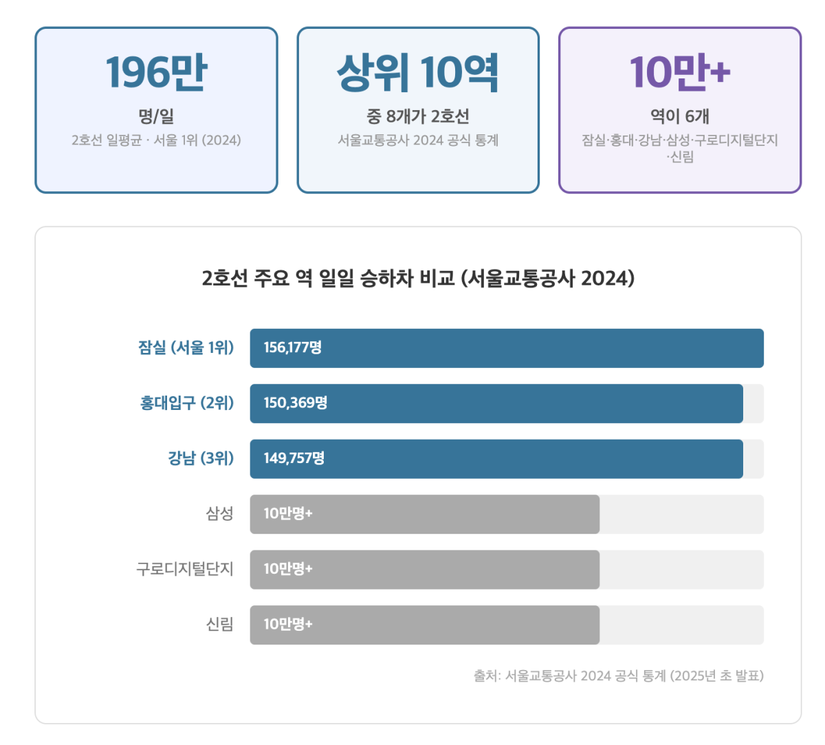 서울교통공사가 발표한 2024년 수송 통계에 따르면 2호선의 일평균 승하차 인원은 196만 4,128명으로, 서울 지하철 1~8호선 전체에서 압도적 1위를 기록했습니다. (서울교통공사, 2024)