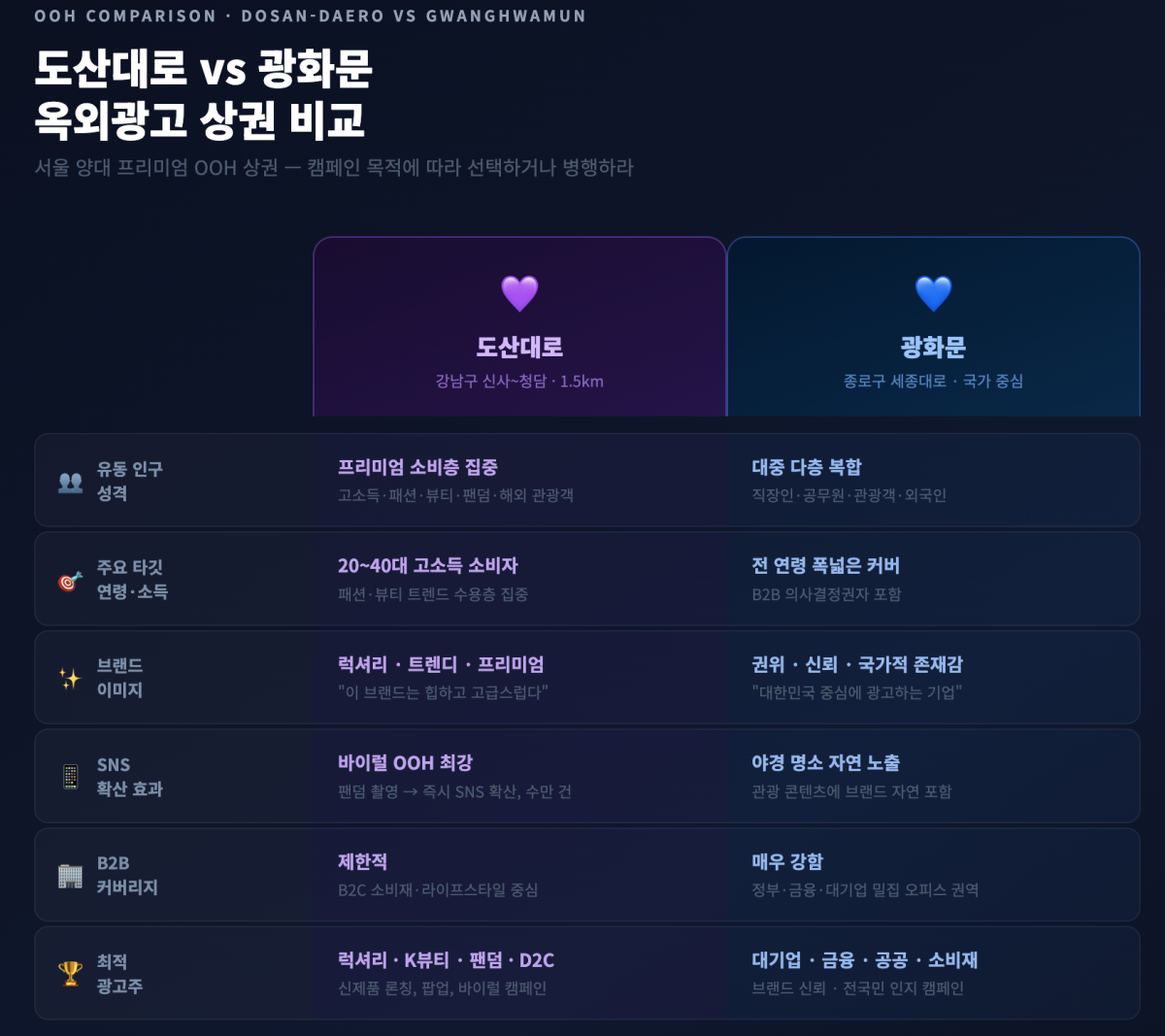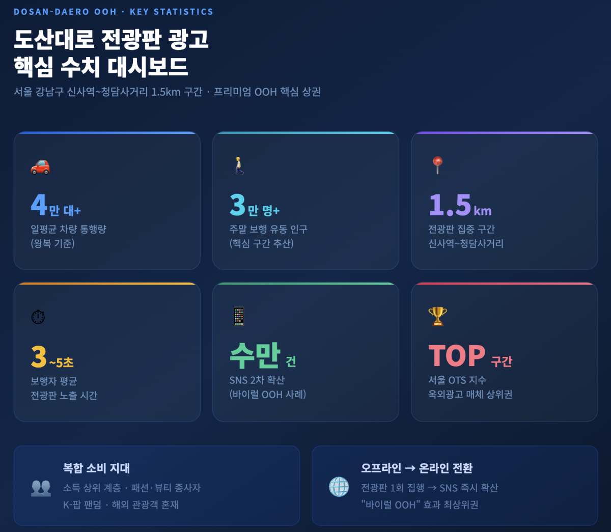 도산대로 핵심 구간의 바이럴 OOH 사례에서는 전광판 1회 집행으로 수만 건의 SNS 2차 확산이 발생한 경우가 보고되고 있습니다.