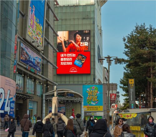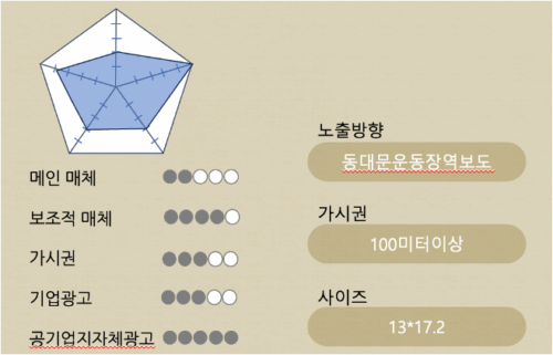 동대문운동장역 14번출구보행로에서 바로 보이는 매체이고 설치위치가 낮아 자연스러운 노출이 됨.